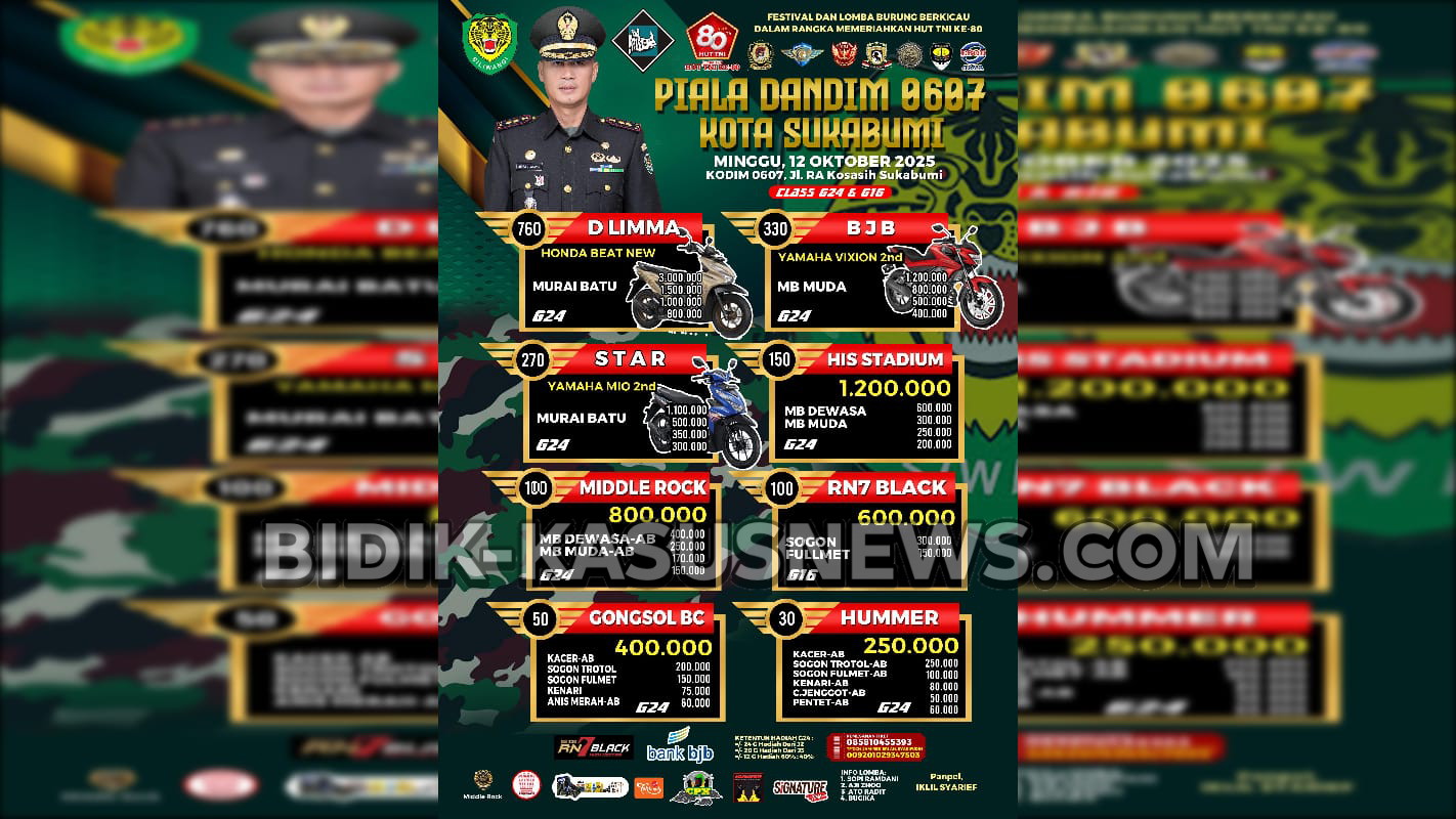 SUKABUMI-BIDIK-KASUSNEWS.COM- Dalam rangka memperingati Hari Ulang Tahun (HUT) ke-80 Tentara Nasional Indonesia (TNI), Kodim 0607/Kota Sukabumi akan menggelar Festival dan Lomba Burung Berkicau Piala Dandim 0607, pada Minggu, 12 Oktober 2025, di Makodim 0607, Jalan R.A. Kosasih, Kota Sukabumi. Kegiatan ini menjadi bagian dari rangkaian perayaan HUT TNI yang bertujuan mempererat silaturahmi antara TNI dan masyarakat, sekaligus memberikan ruang positif bagi komunitas pecinta burung berkicau di Sukabumi dan sekitarnya. Festival yang diperkirakan diikuti ratusan peserta dari berbagai daerah tersebut akan menampilkan sejumlah kelas bergengsi, di antaranya D LIMA, BJB, STAR, HIS STADIUM, MIDDLE ROCK, RN7 BLACK, GONSOL BC, dan HUMMER. Para peserta akan memperebutkan hadiah menarik senilai jutaan rupiah, termasuk hadiah utama berupa sepeda motor. Komandan Kodim 0607/Kota Sukabumi, Letkol Czi Indra Gunawan, mengatakan bahwa kegiatan ini bukan sekadar lomba, melainkan wadah kebersamaan antara TNI dan masyarakat. “Festival ini kami gelar bukan hanya untuk mencari juara, tapi juga untuk mempererat silaturahmi dan menumbuhkan semangat kebersamaan. Kami ingin momentum HUT TNI ke-80 ini membawa manfaat bagi seluruh masyarakat,” ujarnya, Jumat (10/10/2025). Selain menjadi hiburan rakyat, kegiatan ini juga diharapkan dapat menumbuhkan semangat nasionalisme, disiplin, dan sportivitas yang sejalan dengan nilai-nilai luhur TNI. Letkol Indra menegaskan, pihaknya telah menyiapkan pelaksanaan kegiatan secara tertib, aman, dan kondusif. “Mari rayakan HUT TNI dengan semangat kebersamaan. Menang bukan tujuan utama, yang penting kita mempererat silaturahmi dan menjaga kekompakan,” tambahnya. Dengan dukungan berbagai komunitas kicau mania, lomba burung berkicau Piala Dandim 0607/Kota Sukabumi dipastikan menjadi salah satu event paling meriah dalam peringatan HUT TNI ke-80 tahun 2025. (Usep).