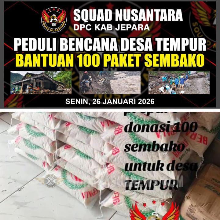 JATENG:Bidik-kasusnews.com Jepara-26-Januari-2026-Squad Nusantara DPC Kabupaten Jepara menunjukkan kepedulian sosial terhadap warga terdampak bencana di Desa Tempur dengan menyalurkan bantuan kemanusiaan berupa 100 paket sembako. Bantuan yang diberikan terdiri dari kebutuhan pokok masyarakat, meliputi beras, gula pasir, minyak goreng, dan mi instan. Dalam setiap paket sembako berisi beras seberat 2,5 kilogram, gula 1 kilogram, minyak goreng kemasan 450 mililiter, serta 7 bungkus mi instan. Total bantuan yang disalurkan mencapai 100 paket. Wakil Kepala Bidang Sosial (Waka Bidsos) Squad Nusantara DPC Jepara, Dian Dwi Rahayanti, menyampaikan bahwa kegiatan tersebut merupakan bentuk kepedulian organisasi terhadap masyarakat yang sedang tertimpa musibah. “Bantuan ini kami salurkan sebagai wujud empati dan solidaritas kepada warga Desa Tempur yang terdampak bencana. Semoga dapat membantu memenuhi kebutuhan dasar masyarakat,” ujar Dian Dwi Rahayanti saat dikonfirmasi Bidik-Kasusnews 26/1/2026. Ia menegaskan bahwa Squad Nusantara DPC Jepara akan terus berkomitmen hadir di tengah masyarakat, khususnya dalam kegiatan sosial dan kemanusiaan. Menurutnya, aksi nyata seperti ini menjadi bagian dari tanggung jawab sosial organisasi. Penyaluran bantuan berjalan dengan lancar dan mendapat sambutan positif dari masyarakat setempat. Warga Desa Tempur mengapresiasi kepedulian Squad Nusantara DPC Jepara yang telah membantu meringankan beban mereka pascabencana. (Wely-jateng)