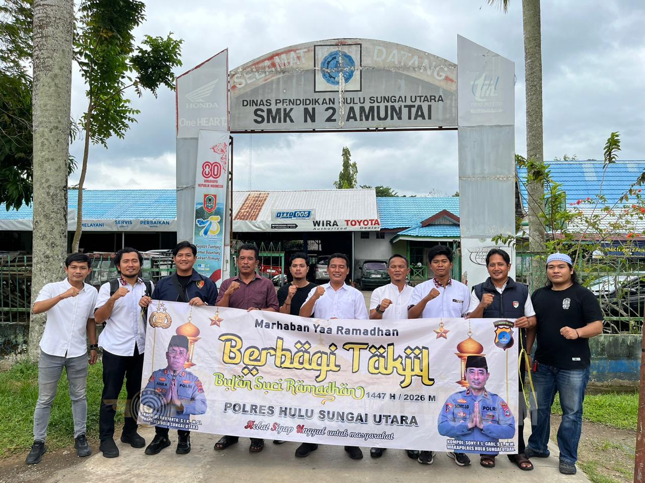 BIDIK-KASUSNEWS.COM Hulu Sungai Utara – Dalam rangka menebar kebaikan di bulan suci Ramadhan 1447 Hijriah, jajaran Satuan Reserse Kriminal (Sat Reskrim) Polres Hulu Sungai Utara (HSU) menggelar kegiatan berbagi takjil kepada masyarakat di depan SMKN 2 Amuntai, Kelurahan Sungai Malang, Kecamatan Amuntai Tengah, Rabu (11/3/2026) sore. Kegiatan sosial tersebut berlangsung sekitar pukul 17.00 hingga 17.20 Wita dan dipimpin langsung oleh Kasat Reskrim Polres HSU bersama seluruh personel Sat Reskrim. Sebanyak 100 paket takjil dibagikan kepada para pengguna jalan yang melintas di lokasi kegiatan, baik pengendara roda dua, roda empat, maupun masyarakat sekitar yang tengah dalam perjalanan menjelang waktu berbuka puasa. Kasat Reskrim Polres HSU mengatakan bahwa kegiatan berbagi takjil ini merupakan bentuk kepedulian sosial sekaligus upaya mempererat hubungan antara kepolisian dan masyarakat, khususnya di momentum bulan Ramadhan yang penuh berkah. “Melalui kegiatan ini, kami ingin berbagi kebahagiaan dengan masyarakat yang sedang menjalankan ibadah puasa. Ini juga menjadi wujud kebersamaan serta kepedulian Polri terhadap masyarakat,” ujarnya di sela kegiatan. Selain memberikan takjil, kegiatan ini juga dimanfaatkan sebagai sarana mempererat komunikasi antara aparat kepolisian dan warga. Kehadiran personel Sat Reskrim di tengah masyarakat diharapkan dapat semakin meningkatkan kepercayaan publik terhadap institusi kepolisian. Para pengguna jalan yang menerima takjil menyambut baik kegiatan tersebut dan mengapresiasi langkah Polres HSU yang turut berbagi kepada masyarakat menjelang waktu berbuka puasa. Kegiatan berlangsung dengan tertib dan lancar, serta mendapat respons positif dari masyarakat yang melintas di kawasan depan SMKN 2 Amuntai. Melalui aksi sederhana namun penuh makna ini, Sat Reskrim Polres Hulu Sungai Utara berharap semangat berbagi dan kebersamaan di bulan Ramadhan dapat terus terjaga di tengah kehidupan masyarakat. (Agus)