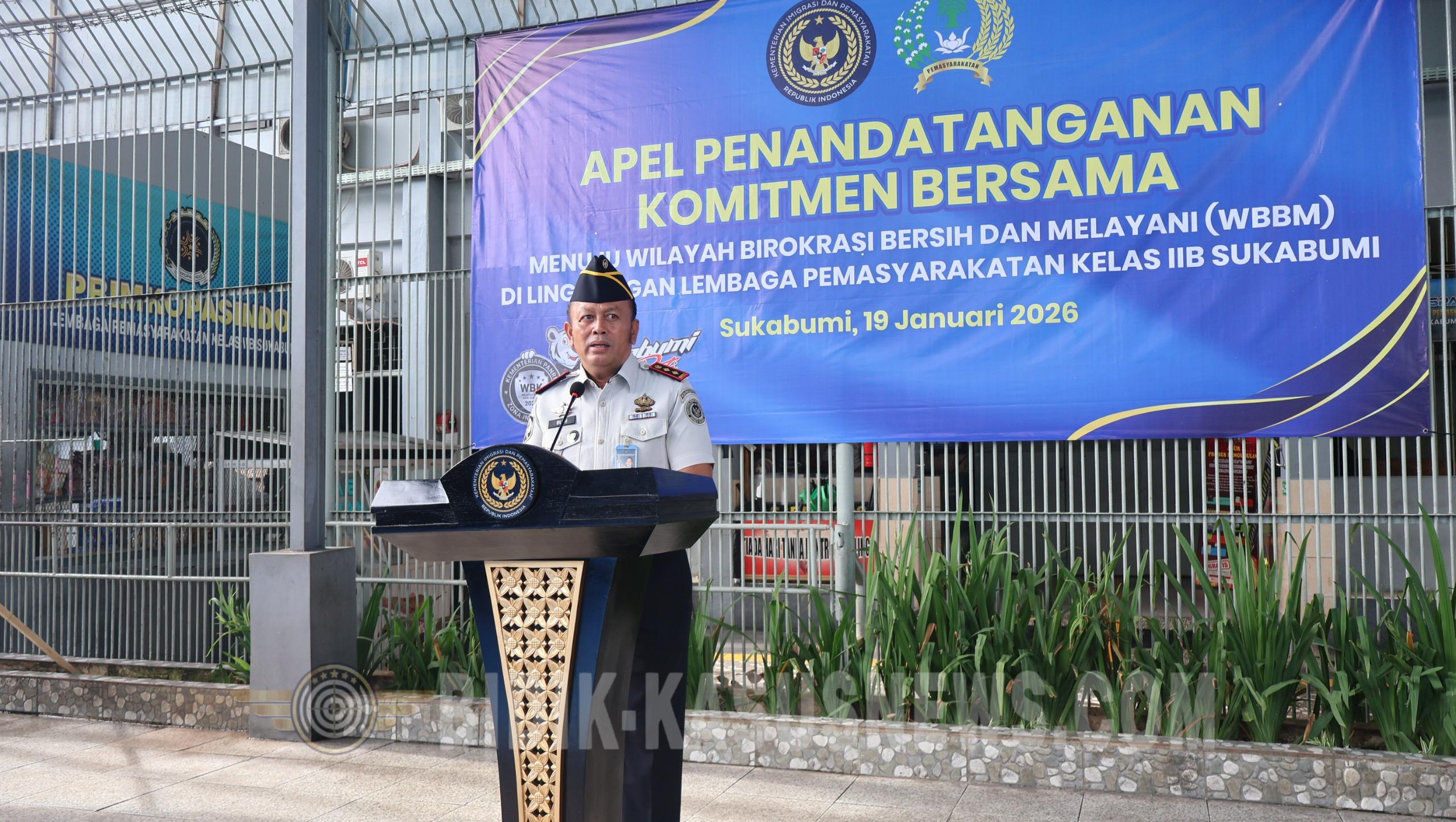 SUKABUMI-BIDIK-KASUSNEWS.COM – Lapas Kelas IIB Sukabumi menggelar Apel Penandatanganan Komitmen Bersama Zona Integritas Tahun 2026 di Lapangan Serbaguna Lapas, Senin (19/1/2026). Apel dipimpin langsung Kepala Lapas Kelas IIB Sukabumi Budi Hardiono dan diikuti pejabat manajerial, seluruh ASN, serta peserta magang. Kegiatan diawali dengan menyanyikan Mars Kementerian Imigrasi dan Pemasyarakatan, dilanjutkan penandatanganan komitmen bersama oleh pejabat eselon IV dan Kepala Lapas. Dalam amanatnya, Budi Hardiono menegaskan bahwa komitmen ini merupakan bentuk keseriusan seluruh jajaran dalam menjaga integritas, konsistensi, dan kebersamaan. ”Semua dilakukan untuk mempertahankan predikat Wilayah Bebas dari Korupsi (WBK) Tahun 2025 serta mempersiapkan langkah menuju Wilayah Birokrasi Bersih dan Melayani (WBBM),” ujarnya, Senin (19/1/2026). Dia menyampaikan bahwa penandatanganan komitmen bukan sekadar seremonial, melainkan janji moral seluruh pegawai untuk bekerja secara disiplin, berintegritas, dan bertanggung jawab. ”Mempertahankan WBK membutuhkan komitmen yang konsisten dan keterlibatan seluruh unsur pegawai, dengan penguatan delapan area perubahan, khususnya Manajemen Perubahan sebagai fondasi utama,” tandasnya. Kegiatan dilanjutkan dengan penandatanganan komitmen oleh seluruh ASN Lapas Kelas IIB Sukabumi dan diakhiri dengan foto bersama. Melalui apel ini, Lapas Kelas IIB Sukabumi menegaskan komitmen bersama untuk terus memperkuat integritas dan kedisiplinan kerja, serta secara konsisten mendukung delapan area perubahan Zona Integritas sebagai langkah menuju WBBM Tahun 2026. (Usep)