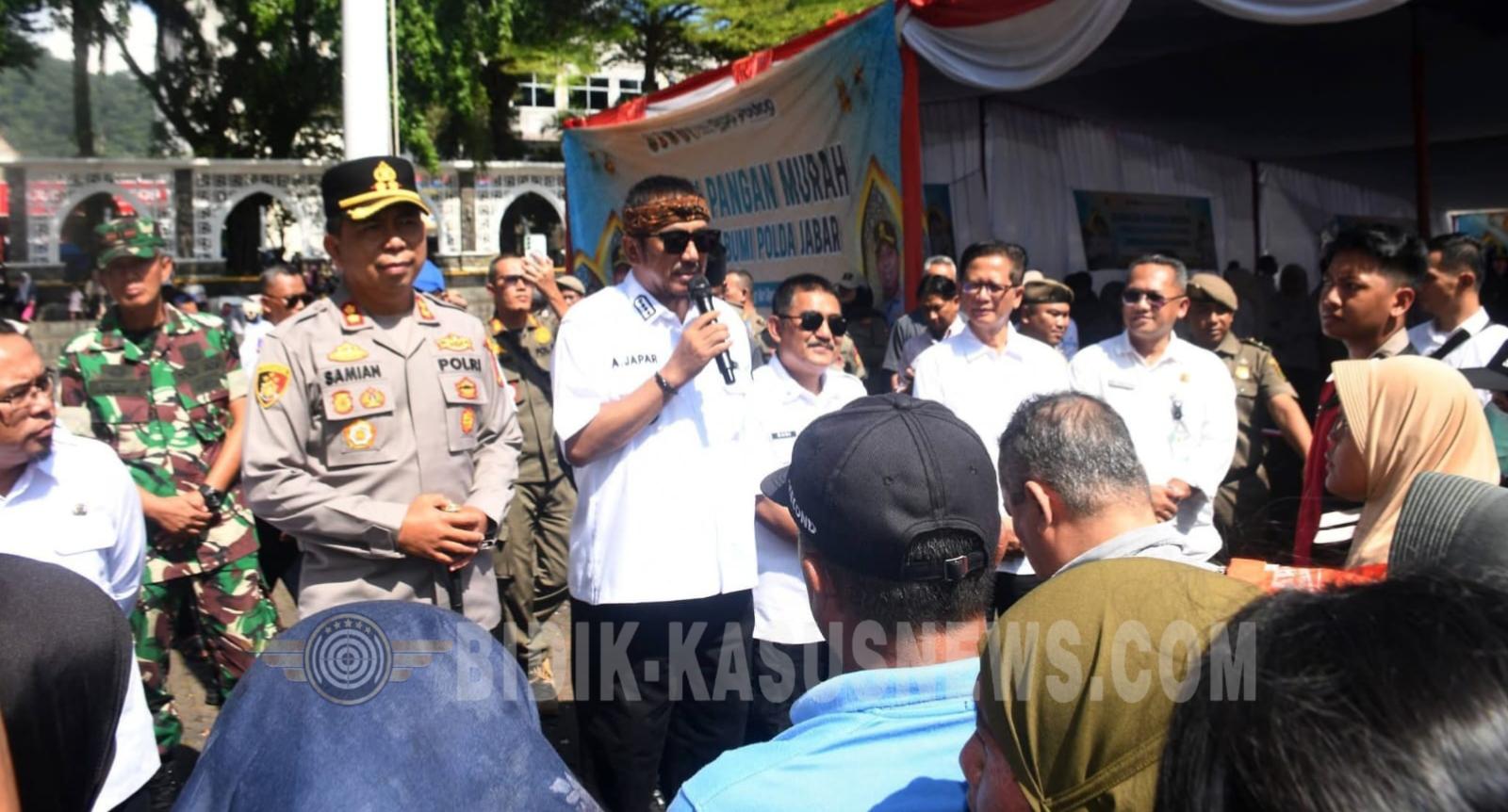 SUKABUMI-BIDIK-KASUSNEWS.COM – ntusiasme masyarakat terlihat tinggi saat Gerakan Pangan Murah digelar di Alun-alun Palabuhanratu, Rabu (11/3/2026). Sejak siang hari, ratusan hingga ribuan warga memadati lokasi kegiatan untuk mendapatkan bahan kebutuhan pokok dengan harga yang lebih terjangkau dibandingkan harga pasar. Kegiatan yang dimulai sekitar pukul 13.00 WIB tersebut disambut warga dari berbagai desa di Kecamatan Palabuhanratu. Mereka datang membawa kupon yang sebelumnya telah dibagikan oleh panitia. Tercatat sekitar 1.000 kupon telah didistribusikan kepada masyarakat yang berasal dari 9 desa dan 1 kelurahan di wilayah tersebut. Dalam Gerakan Pangan Murah ini, masyarakat dapat membeli sedikitnya 14 jenis komoditas bahan pokok penting dengan harga subsidi. Berbagai kebutuhan yang tersedia di antaranya beras SPHP, beras premium, minyak goreng, daging ayam, serta daging sapi bagian paha depan. Kapolres Sukabumi, AKBP Samian, menjelaskan bahwa program tersebut merupakan bagian dari Gerakan Pangan Murah yang dilaksanakan serentak di berbagai daerah di Jawa Barat. Kegiatan ini bertujuan membantu masyarakat memperoleh kebutuhan pokok dengan harga yang lebih terjangkau, khususnya menjelang Hari Raya Idulfitri. “Kegiatan ini merupakan bentuk sinergi antara Polri dan pemerintah daerah untuk membantu masyarakat mendapatkan bahan pokok berkualitas dengan harga yang lebih terjangkau,” terangnya. Karena stoknya terbatas, kami mengimbau masyarakat membeli secukupnya agar semua warga dapat merasakan manfaatnya, tambahnya. Sementara itu, Bupati Sukabumi H. Asep Japar menyampaikan apresiasi kepada jajaran Polres Sukabumi yang telah berkolaborasi dengan Pemerintah Kabupaten Sukabumi dalam menghadirkan program yang langsung dirasakan manfaatnya oleh masyarakat. “Alhamdulillah masyarakat sangat antusias. Mudah-mudahan kegiatan ini bisa membantu meringankan kebutuhan warga, terutama menjelang Idulfitri 1447 Hijriah,” katanya. Salah seorang warga, Parida Mustopa, mengaku sangat terbantu dengan adanya pasar murah tersebut. Warga Kampung Badak Putih, Kelurahan/Kecamatan Palabuhanratu itu mengatakan harga kebutuhan pokok yang dijual dalam kegiatan tersebut jauh lebih murah dibandingkan harga di pasaran. “Saya mengucapkan terima kasih kepada Pak Bupati, Pak Kapolres dan seluruh jajaran yang sudah mengadakan pasar murah ini. Harganya lebih terjangkau sehingga sangat membantu masyarakat,” ungkapnya. Parida berharap kegiatan serupa dapat terus digelar secara berkala karena sangat dirasakan manfaatnya oleh warga, terutama bagi masyarakat dengan kondisi ekonomi yang terbatas. (Dicky)