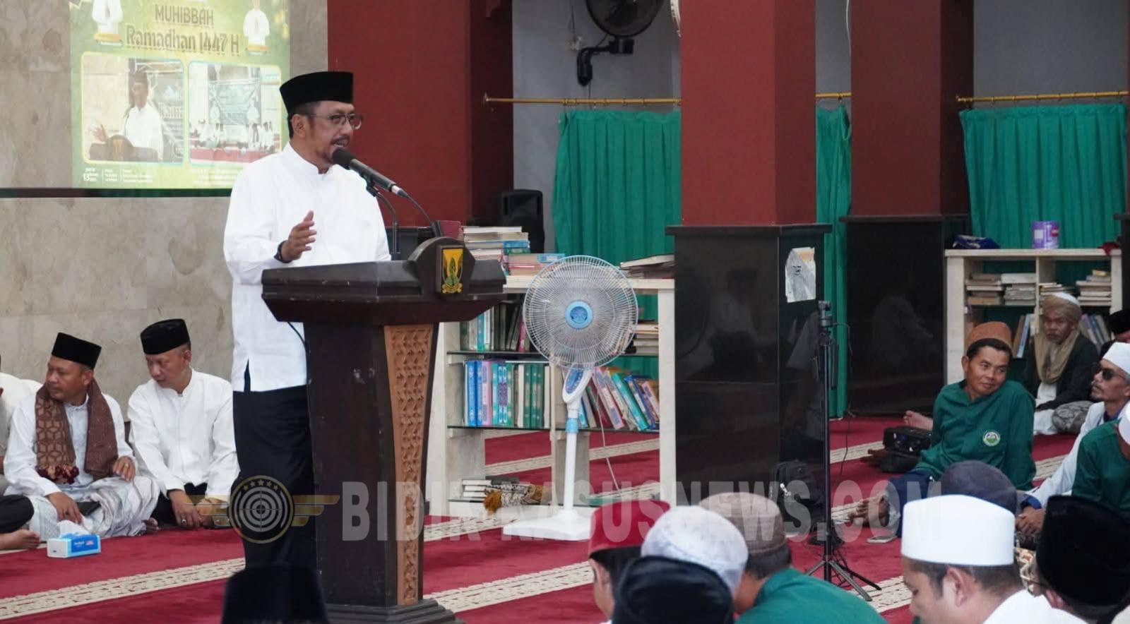 SUKABUMI-BIDIK-KASUSNEWS.COM – Ketua DPRD Kabupaten Sukabumi, Budi Azhar Mutawali, mendampingi Bupati Sukabumi, Asep Japar, dalam kegiatan Muhibah Ramadan 1447 H/2026 M yang digelar di Masjid Besar Al-Hidayah Kaum Sagaranten, Jumat (13/3/2026). Kegiatan yang berlangsung khidmat tersebut dirangkaikan dengan pembukaan undian umrah gratis serta pengumuman guru ngaji yang berkesempatan menunaikan ibadah ke Tanah Suci. Pengundian dilakukan langsung oleh Ketua DPRD Kabupaten Sukabumi, Budi Azhar Mutawali. Dari hasil undian tersebut, seorang guru ngaji bernama Abah Dendi, warga Kampung Baros, terpilih sebagai penerima hadiah umrah gratis. Dalam sambutannya, Bupati Sukabumi Asep Japar mengajak masyarakat menjadikan Ramadan sebagai momentum memperkuat keimanan dan meningkatkan kualitas diri. “Momen bulan suci ini dapat dimanfaatkan untuk memperbanyak amal ibadah serta mempererat kebersamaan di tengah masyarakat,” kata bupati. Sementara itu, Ketua DPRD Budi Azhar Mutawali menyampaikan bahwa kegiatan tersebut merupakan bentuk kepedulian pemerintah daerah terhadap masyarakat, khususnya para guru ngaji yang selama ini berperan besar dalam membina generasi muda. Menurutnya, pemberian hadiah umrah gratis merupakan bentuk penghargaan atas pengabdian para guru ngaji dalam mendidik dan menanamkan nilai-nilai agama kepada anak-anak. Ia juga menegaskan bahwa kegiatan ini sejalan dengan visi Kabupaten Sukabumi Mubarokah (Maju, Unggul, Berbudaya, dan Berkah). Selain pengundian umrah gratis, kegiatan Muhibah Ramadan tersebut juga diisi dengan penyerahan santunan kepada anak-anak yatim serta pembagian paket sembako kepada masyarakat dhuafa. Abah Dendi yang terpilih sebagai penerima hadiah umrah gratis mengaku bersyukur atas kesempatan yang diterimanya. Ia menyampaikan terima kasih kepada pemerintah daerah atas perhatian yang diberikan kepada para guru ngaji, serta berharap dapat memanfaatkan kesempatan tersebut untuk meningkatkan ibadah dan keimanan. Acara yang dihadiri unsur pejabat daerah, tokoh masyarakat, dan warga setempat itu ditutup dengan kegiatan buka puasa bersama dalam suasana penuh kebersamaan. (Dicky)