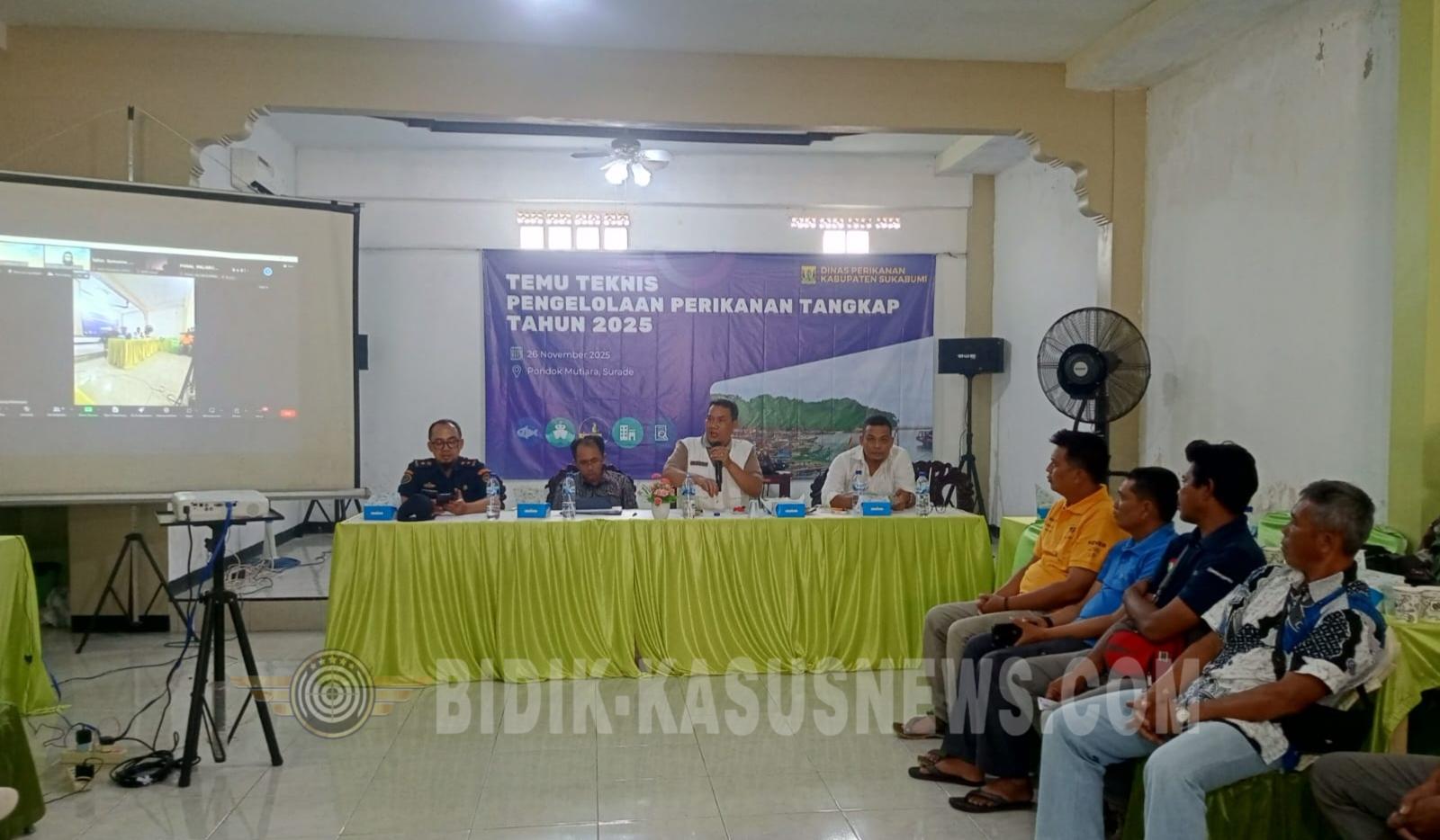 SUKABUMI-BIDIK-KASUSNEWS.COM – Dinas Perikanan Kabupaten Sukabumi menggelar Temu Teknis Nelayan Tangkap Ikan Tahun 2025 di Hotel Pondok Mutiara Sariah, Desa Pasiripis, Kecamatan Surade, Rabu (26/11/2025). Kegiatan ini menghadirkan 80 peserta dari dua kecamatan pesisir. Kepala Dinas Perikanan dan Kelautan Kabupaten Sukabumi, Sri Padmoko, menjelaskan bahwa kegiatan ini bertujuan meningkatkan pemahaman nelayan mengenai teknis pengelolaan perikanan tangkap, arah kebijakan pembangunan, serta pemanfaatan sarana dan prasarana bantuan. “Sebelum kelompok nelayan menerima bantuan, perlu ada sosialisasi pemanfaatan bantuan tersebut agar tepat guna dan tepat sasaran,” ujar Sri Padmoko. Kegiatan juga menghadirkan Forkopimcam Surade agar mengetahui regulasi dan turut mengawasi implementasi materi di lapangan. Penyuluh perikanan serta perwakilan kelompok nelayan turut menjadi peserta. Para narasumber berasal dari berbagai institusi, di antaranya Dinas Perikanan dan Kelautan Provinsi Jawa Barat, akademisi PSP IPB Bogor, Satker SDKP Sukabumi, Polsek Surade, dan Pos TNI AL Ujunggenteng. Setelah paparan mengenai potensi perikanan tangkap di kawasan Minajaya dan Ujunggenteng oleh Kadis Perikanan, acara dilanjutkan dengan sambutan dari Yofi Yuspilan dari Satker SDKP Sukabumi. Pembukaan kegiatan dilakukan oleh Kasi Trantib Kecamatan Surade, H. Rumbayana, yang mewakili Camat Surade Unang Suryana. Dalam sambutannya, ia menegaskan bahwa Surade dan Ciracap memiliki potensi laut besar yang harus dimanfaatkan secara optimal untuk meningkatkan kesejahteraan nelayan. “Diperlukan dukungan lintas sektor dan para pemangku kepentingan untuk mencapai tujuan pembangunan kelautan dan perikanan, terutama dalam meningkatkan perekonomian masyarakat,” ujarnya saat membuka acara. (Dicky)