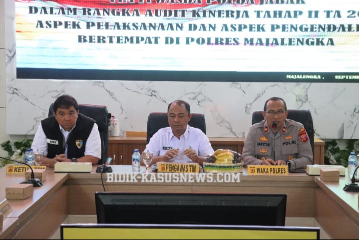 Majalengka Bidik-kasusnews.com,.Kedatangan Tim Pengawasan dan Pemeriksaan (Wasrik) dari inspektorat Pengawasan Daerah (Itwasda) Kepolisian Daerah (Polda) Jabar disambut langsung oleh Kapolres Majalengka AKBP Willy Andrian bersama Pejabat Utama dan Para Kapolsek jajaran di Aula Sindangkasih Polres Majalengka, Jumat (19/9/2025). Kedatangan Tim yang diketua oleh Kombes Pol Sarwo, hadir bersama rombongan tim yakni KOMPOL Jani, KOMPOL Arie, KOMPOL Syahroni, KOMPOL Nurul, AKP Agus Mulyadi dan Bintara Itwasda Polda Jabar. Kapolres Majalengka yang diwakili Wakapolres Majalengka KOMPOL Asep Agustoni dalam sambutannya mengatakan selamat datang kepada Tim Wasrik Tahap II Itwasda Polda Jabar, dimana dengan adanya kedatangan Tim Wasrik diharapkan dapat memberikan petunjuk serta arahan untuk mendukung jalannya kegiatan operasional dengan lebih baik. ”Trima kasih atas kedatangan Tim Wasrik Polda Majalengka di Polres Majalengka semoga dengan kegiatan ini dapat dijadikan wadah dan sarana untuk berkonsultasi sehingga dalam pelaksanaan tugas tidak terdapat kendala dan halangan, ” imbuh Wakapolres. Setelah penyambutan, tim bersama anggota melanjutkan kegiatan dengan pemeriksaan di tempat yang sama dengan aspek sasaran perencanaan dan pengorganisasian dari masing- masing satuan kerja yang ada di polres Majalengka. Selain itu tim juga melakukan pemeriksaan administrasi dan pertanggung jawaban dari masing-masing satuan kerja meliputi manajemen Opsnal, Sarpras, Garkeu dan manajemen SDM. Asep. Rusliman