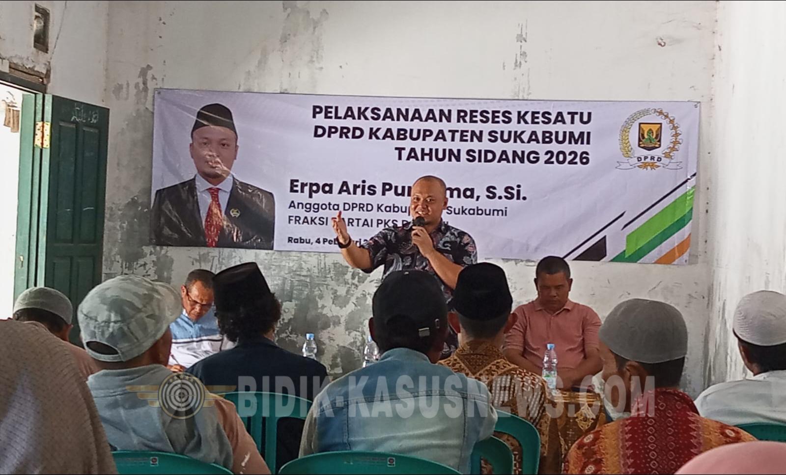 SUKABUMI-BIDIK-KASUSNEWS.COM – Anggota Komisi I DPRD Kabupaten Sukabumi dari Fraksi PKS, Erpa Aris Purnama, S.Si., menggelar Reses Kesatu Tahun Sidang 2026 di Kampung Cipari, RT 02 RW 04, Desa Sukatani, Kecamatan Surade, Kamis (5/2/2026). Kegiatan reses dihadiri Kepala Desa Sukatani H. Sulaeman, tokoh masyarakat, tokoh agama, tokoh pemuda, serta puluhan warga. Acara dipandu oleh Asep Solihin dan diawali pembacaan ayat suci Alquran serta sholawat oleh Ustadz Abas. Dalam forum tersebut, warga menyampaikan sejumlah aspirasi strategis, di antaranya peningkatan infrastruktur jalan lingkungan, penguatan sarana pertanian, dukungan bagi Kelompok Wanita Tani (KWT) dan UMKM, kemudahan perizinan, pengembangan peternakan, hingga perluasan lapangan kerja. Perwakilan warga Usman Gojali menyoroti kebutuhan akses peternakan dan dampak aturan pernikahan baru. Sementara itu, Ibu Asma mengusulkan penguatan KWT dan UMKM lokal. Aspirasi lain disampaikan Ibu Saptinah terkait bantuan bagi anak penyandang disabilitas, Siti Naria Solehah (12). Erpa Aris Purnama menyampaikan terima kasih dan komitmennya untuk menampung seluruh aspirasi masyarakat. Ia menegaskan, seluruh usulan akan diinput melalui Sistem Informasi Pembangunan Daerah dan diperjuangkan dalam program pembangunan tahun 2027. “Reses menjadi ruang penting untuk mendengar kebutuhan riil masyarakat. Aspirasi yang disampaikan akan kami perjuangkan sesuai kewenangan,” ujarnya. Ia juga menegaskan komitmen mendorong penguatan UMKM, khususnya di wilayah Dapil VI, sebagai upaya meningkatkan perekonomian masyarakat. Dalam kesempatan tersebut, Erpa secara langsung memberikan bantuan uang tunai kepada anak penyandang disabilitas serta bantuan untuk keperluan masjid setempat. Kegiatan reses ditutup dengan doa yang dipimpin Ustadz Solihin. (Dicky)