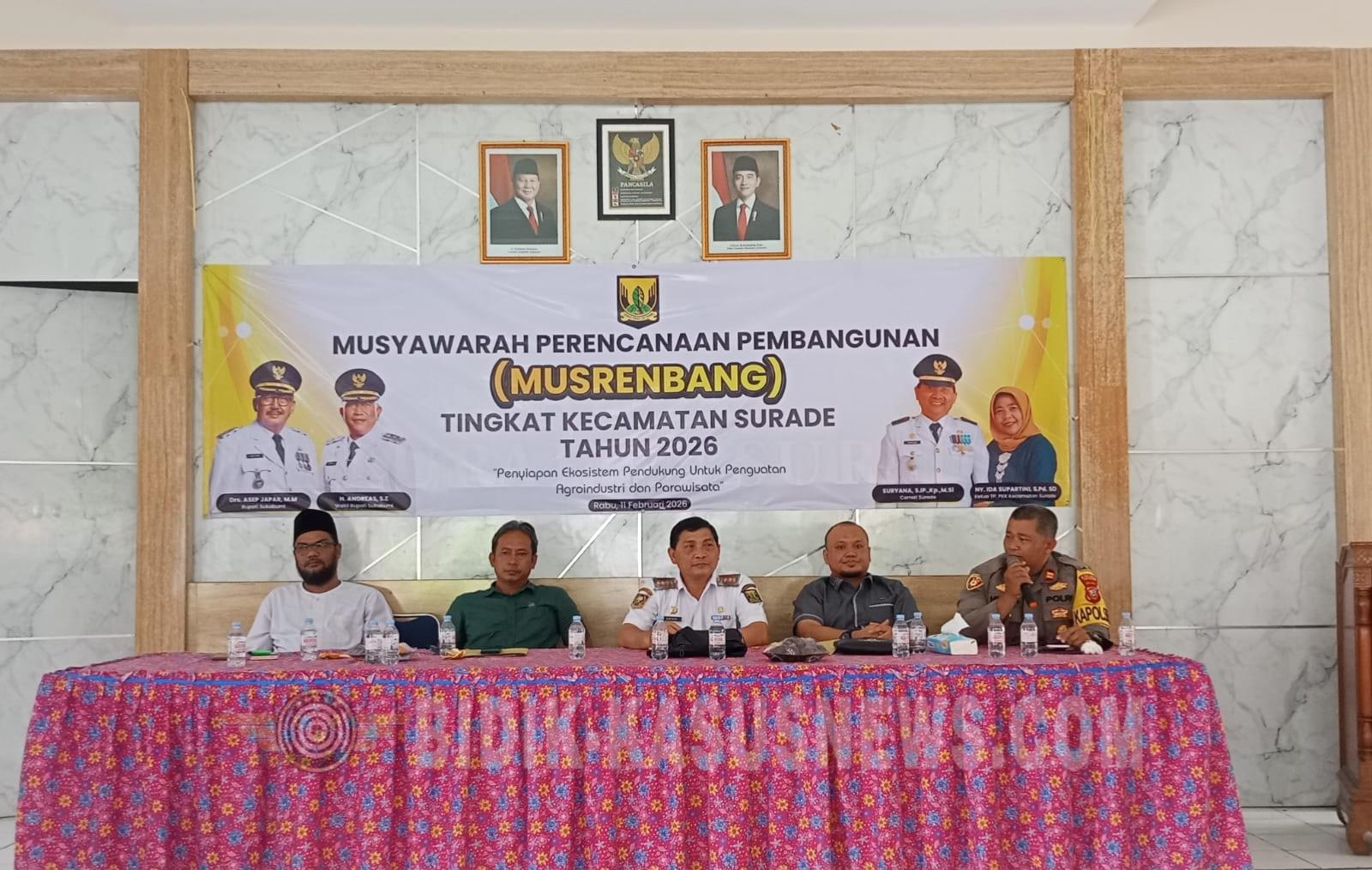 SUKABUMI-BIDIK-KASUSNEWS.COM – Pemerintah Kecamatan Surade menggelar Musyawarah Perencanaan Pembangunan (Musrenbang) tingkat kecamatan untuk Tahun Anggaran 2026–2027. Kegiatan tersebut dipusatkan di Aula Kecamatan Surade, Kabupaten Sukabumi, Rabu (11/2/2026). Musrenbang menjadi forum strategis dalam menyerap, merumuskan, serta menyelaraskan berbagai usulan pembangunan dari seluruh desa di wilayah Kecamatan Surade. Tahun ini, Musrenbang mengusung tema “Penyiapan Ekosistem Pendukung untuk Penguatan Agroindustri dan Pariwisata”, sejalan dengan arah kebijakan pembangunan Kabupaten Sukabumi yang menitikberatkan pada penguatan ekonomi lokal berbasis potensi wilayah. Pelaksanaan Musrenbang dilakukan secara hybrid, yakni tatap muka dan terhubung melalui Zoom Meeting dengan Dinas Pemberdayaan Masyarakat dan Desa (DPMD) serta Badan Perencanaan Pembangunan, Penelitian dan Pengembangan Daerah (Baperinda) Kabupaten Sukabumi. Kegiatan tersebut dihadiri Anggota DPRD Kabupaten Sukabumi Erpa Aris Purnama, S.Si dari Komisi I Fraksi PKS, Anggota DPRD dari Komisi III Fraksi Partai PKB H. Dadang Hermawan. Tampak hadir Danramil 0622-14 Surade Katen Dikdik, Kapolsek Surade Iptu Ade Hendra, Ketua MUI Kecamatan Surade Asep Mustofa (Aa Bentang), serta para kepala desa se-Kecamatan Surade. Kehadiran unsur legislatif, TNI-Polri, tokoh agama, dan pemerintah desa mencerminkan kuatnya sinergi lintas sektor dalam mendukung perencanaan pembangunan yang partisipatif dan berkelanjutan. Camat Surade Unang Suryana menegaskan bahwa Musrenbang kecamatan merupakan tahapan krusial dalam sistem perencanaan pembangunan daerah. Seluruh usulan, menurutnya, harus disusun secara matang berdasarkan kebutuhan riil masyarakat serta selaras dengan kebijakan daerah dan kemampuan anggaran. “Musrenbang ini adalah ruang strategis untuk menyatukan kepentingan masyarakat desa dengan arah pembangunan kabupaten. Karena itu, diperlukan sinergi antara pemerintah desa, kecamatan, dan DPRD agar hasilnya benar-benar dapat diwujudkan,” ujarnya. Peran DPRD dalam Musrenbang turut menjadi sorotan. Erpa Aris Purnama menekankan bahwa kehadirannya bukan sekadar agenda seremonial, melainkan bagian dari tanggung jawab wakil rakyat dalam menyerap dan mengawal aspirasi masyarakat sejak tahap perencanaan. “Musrenbang kecamatan menjadi fondasi penting bagi DPRD. Setiap usulan masyarakat Surade akan kami catat dan perjuangkan dalam pembahasan RKPD dan APBD, khususnya yang berkaitan dengan pendidikan, kesehatan, pertanian, serta pemberdayaan ekonomi masyarakat,” tegasnya. Ia juga menyoroti potensi besar Kecamatan Surade dalam pengembangan agroindustri dan pariwisata desa. Potensi tersebut, menurutnya, harus didukung kebijakan yang tepat sasaran, pembangunan infrastruktur penunjang, serta penguatan kapasitas sumber daya manusia. “Jika perencanaan dilakukan dengan baik dan dikawal bersama, Surade berpeluang tumbuh secara ekonomi tanpa meninggalkan kearifan lokal. DPRD siap menjadi jembatan antara aspirasi masyarakat dan kebijakan pemerintah daerah,” tambahnya. Senada dengan itu, H. Dadang Hermawan menyampaikan dukungan terhadap program prioritas yang berorientasi pada penguatan ekonomi desa, peningkatan kualitas sumber daya manusia, serta pembangunan yang berkelanjutan. Dalam sesi diskusi, para kepala desa secara aktif menyampaikan berbagai kebutuhan pembangunan, mulai dari peningkatan infrastruktur jalan desa, sarana prasarana pertanian, penguatan UMKM, hingga pengembangan destinasi wisata lokal. Perwakilan Kepala Desa Pasiripis, Wahyudin, mengapresiasi kehadiran DPRD dan seluruh unsur terkait. Ia berharap hasil Musrenbang dapat ditindaklanjuti dalam program pembangunan yang berdampak langsung bagi masyarakat. “Dengan DPRD yang hadir dan mendengar langsung aspirasi desa, kami optimistis usulan pembangunan dapat dikawal hingga tingkat kabupaten,” ujarnya. Hasil Musrenbang Kecamatan Surade selanjutnya akan dirangkum sebagai bahan penyusunan Rencana Kerja Pemerintah Daerah (RKPD) Kabupaten Sukabumi Tahun Anggaran 2026–2027. Pemerintah berharap sinergi yang solid antara pemerintah daerah, DPRD, dan seluruh pemangku kepentingan mampu menghasilkan perencanaan pembangunan yang lebih terarah, aspiratif, dan responsif terhadap kebutuhan masyarakat. (Dicky)