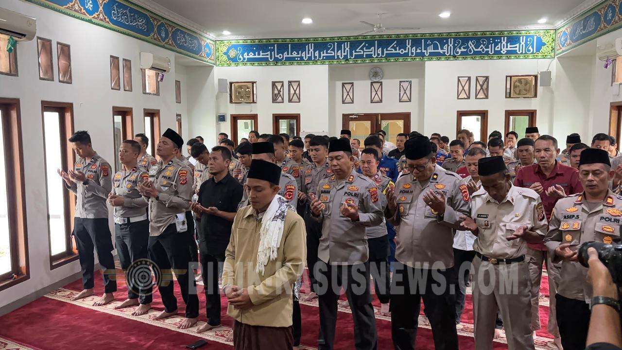 SUKABUMI-BIDIK-KASUSNEWS.COM – Polres Sukabumi menggelar Shalat Ghaib dan doa bersama untuk dua anggota Polri yang gugur dalam tugas, Ipda Anumerta Hendra Kurniawan dan Aiptu Anumerta M. Jerry Sonconery, serta mendoakan para korban bencana alam di wilayah Cisarua, Kabupaten Bandung Barat. Kegiatan berlangsung di Masjid Adh-Durachman Polres Sukabumi, Rabu (28/01/2026). Shalat Ghaib dipimpin Ust Damiri dan diikuti Kapolres Sukabumi AKBP Dr. Samian, S.H., S.I.K., M.H., jajaran pejabat utama, perwira, bintara, ASN Polri, serta jamaah masjid. Kapolres Sukabumi AKBP Dr. Samian menyampaikan bahwa kegiatan tersebut merupakan bentuk empati dan penghormatan atas pengabdian anggota Polri yang gugur dalam tugas, sekaligus doa bagi masyarakat yang terdampak bencana. “Kami mendoakan dua anggota Polri terbaik yang gugur agar mendapat tempat terbaik di sisi Allah SWT, serta keluarga yang ditinggalkan diberikan ketabahan,” ujarnya. Selain itu, doa juga dipanjatkan bagi para korban bencana alam di Cisarua agar diberi kekuatan, keselamatan, serta percepatan pemulihan. Sementara itu, Ustadz Damiri dalam tausiah menyampaikan bahwa gugurnya anggota Polri dalam tugas merupakan pengorbanan mulia yang patut diteladani. “Pengabdian mereka adalah contoh keikhlasan dan tanggung jawab. Mari kita perbanyak doa dan meningkatkan keimanan, serta mendoakan saudara-saudara kita yang tertimpa musibah agar diberi kesabaran dan pertolongan,” tuturnya. (Dicky)