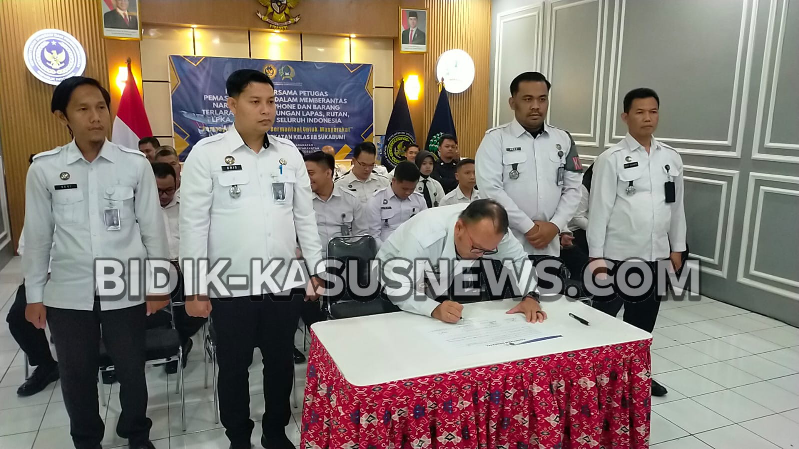 SUKABUMI-BIDIK-KASUSNEWS.COM – Lembaga Pemasyarakatan (Lapas) Kelas IIB Sukabumi menegaskan komitmen bersama untuk memberantas peredaran narkoba, handphone ilegal, dan barang terlarang lainnya di lingkungan pemasyarakatan. Penandatanganan komitmen ini digelar secara serentak di seluruh Lapas, Rutan, LPKA, dan Bapas se-Indonesia melalui sambungan daring. Kegiatan yang berlangsung di Aula Lapas Kelas IIB Sukabumi ini diikuti oleh seluruh pejabat struktural, fungsional, dan jajaran pelaksana. Acara diawali dengan menyanyikan Lagu Indonesia Raya, pembacaan doa, serta penandatanganan komitmen bersama oleh Direktur Jenderal Pemasyarakatan, Drs. Mashudi, disusul seluruh satuan kerja pemasyarakatan di tanah air. Dalam arahannya, Mashudi menegaskan pentingnya menjaga keamanan dan ketertiban di dalam lembaga pemasyarakatan. Ia menekankan agar tidak ada lagi pelanggaran yang berkaitan dengan peredaran narkoba maupun penggunaan handphone ilegal. Selain itu, Mashudi juga menyoroti pentingnya sinergi dengan TNI–Polri serta pelaksanaan patroli rutin demi mencegah potensi gangguan keamanan. Sementara itu, Kepala Lapas Kelas IIB Sukabumi, Budi Hardiono, A.Md.IP., S.H., M.H. menegaskan bahwa komitmen ini bukan sekadar seremonial. “Kami sepenuhnya mendukung arahan Direktur Jenderal Pemasyarakatan untuk mewujudkan lingkungan kerja yang bersih dari narkoba dan barang terlarang. Ini adalah bentuk tanggung jawab moral seluruh petugas dalam menjaga marwah institusi serta menciptakan Lapas yang aman dan tertib,” ujarnya. Melalui kegiatan ini, Kalapas Sukabumi menegaskan kesiapannya untuk terus bekerja profesional, disiplin, dan berintegritas tinggi demi terwujudnya lingkungan pemasyarakatan yang bersih dan bebas dari segala bentuk pelanggaran. (Usep)