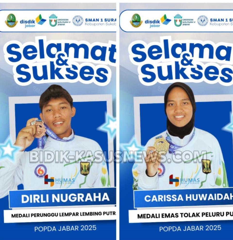 SUKABUMI-BIDIK-KASUSNEWS.COM- Kontingen Kabupaten Sukabumi mencatat sejarah manis pada Pekan Olahraga Pelajar Daerah (POPDA) Jawa Barat XIV 2025. Cabang olahraga atletik menjadi penyumbang medali emas pertama sekaligus memecah kebuntuan perolehan medali. Atlet SMAN 1 Surade, Carissa Huwaidah, sukses meraih emas pada nomor tolak peluru. Tambahan medali perunggu disumbangkan Dirli Nugraha dari nomor lempar lembing. Kedua nomor ini dipertandingkan di Venue Arcamanik, Kota Bandung, Selasa (23/9/2025). Sorak bangga mengiringi penampilan gemilang Carissa dan Dirli. Momen haru mewarnai podium ketika bendera Kabupaten Sukabumi dikibarkan, menandai awal manis perjuangan Sukabumi di ajang olahraga pelajar tingkat Jawa Barat. Kepala SMAN 1 Surade, Suhendi, S.Pd., M.Pd. melalui Wakasek Humas, Dian Wardiana, menyampaikan apresiasi setinggi-tingginya kepada kedua atlet dan guru PJOK, Rami Paisal A.J., S.Pd. atas perjuangan mereka. “Prestasi ini bukan hanya kebanggaan pribadi, tetapi juga bagi SMAN 1 Surade, PASI, dan KONI Kabupaten Sukabumi. Terima kasih kepada semua pihak, khususnya Disbudpora Kabupaten Sukabumi yang terus memberikan dukungan,” ujarnya, Rabu (24/9/2025). Ketua PASI Kabupaten Sukabumi, Sukandar, S.Kom, berharap prestasi ini menjadi motivasi bagi pelajar lain untuk terus meningkatkan kemampuan. “Teruslah berlatih, berprestasi, dan menjadi inspirasi generasi muda. Kami targetkan hasil POPDA ini dapat memperkuat kontingen Sukabumi di BK Porprov 2025 dan Porprov Jabar 2026,” tegasnya. Pada POPDA Jabar XIV, cabor atletik Kabupaten Sukabumi mengoleksi dua medali emas dan satu perunggu. Hasil ini menjadi modal penting untuk menghadapi ajang olahraga tingkat provinsi dan nasional berikutnya. (Dicky)