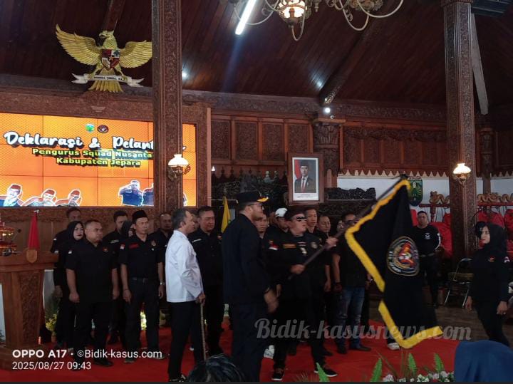 JATENG:Bidik-kasusnews.com Jepara, 27 Agustus 2025 – Squad Nusantara Kabupaten Jepara resmi mendeklarasikan dan melantik kepengurusan PAC Squad Nusantara di Pendopo Kabupaten Jepara, Rabu (27/8/2025). Acara tersebut dihadiri ratusan anggota, tokoh organisasi, serta jajaran pejabat daerah. Dalam pelantikan ini, Eko Basuki ditetapkan sebagai Ketua Dewan Pimpinan Cabang (DPC) Squad Nusantara Kabupaten Jepara, didampingi oleh Wakil Ketua DPC Andre yang turut dilantik bersama jajaran pengurus lainnya. Acara berlangsung khidmat dengan kehadiran sejumlah tokoh penting. Hadir sebagai pembina Squad Nusantara, Gus Bayu, serta Ketua DPW Squad Nusantara Jawa Tengah, Didik Nalogo. Sementara dari tingkat pusat, turut hadir Ketua Umum Squad Nusantara, RM Jaluseno Aji. Dari jajaran pemerintah daerah, Wakil Bupati Jepara Muhammad Ibnu Hajar memberikan apresiasi atas berdirinya kepengurusan baru ini. Hadir pula Kepala Rutan Jepara, Bapak Renza, perwakilan Kapolres Jepara AKP Bambang, perwakilan Kodim 0719/Jepara Letda Novi Norma, serta perwakilan dari Kejaksaan Negeri Jepara. Sekitar 500 anggota Squad Nusantara Kabupaten Jepara juga ikut memadati pendopo untuk memberikan dukungan kepada para pengurus yang baru dilantik. Dalam sambutannya, para pimpinan organisasi menegaskan bahwa Squad Nusantara hadir sebagai wadah persatuan, kepedulian sosial, dan pemberdayaan masyarakat di Kabupaten Jepara.(Wely-jateng)