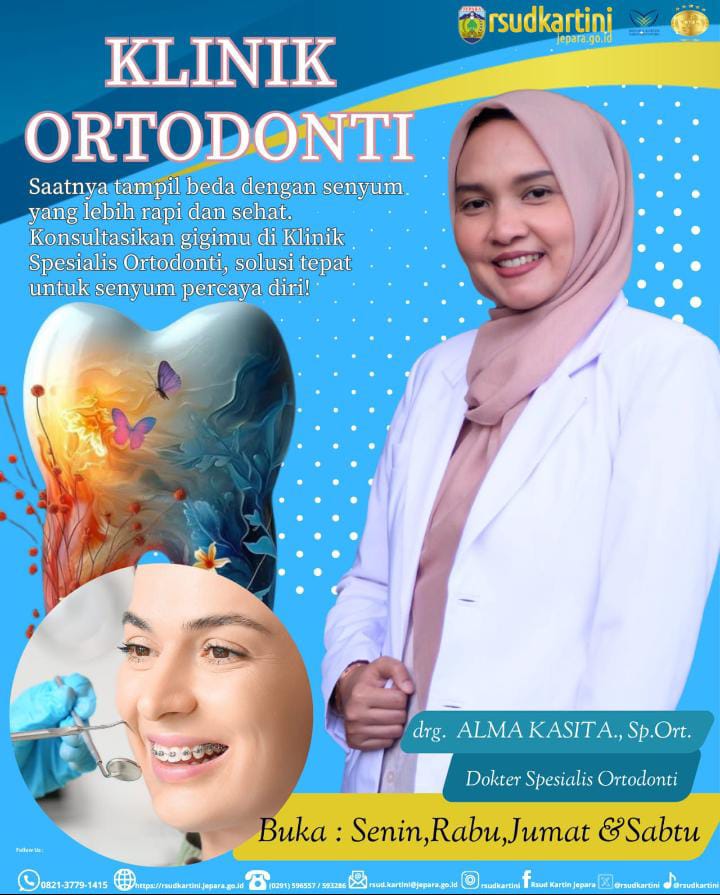 JATENG:Bidik-kasusnews.com Jepara-6-September-2025 Memiliki gigi yang rapi dan sehat bukan sekadar soal penampilan. Susunan gigi yang baik dapat memudahkan proses mengunyah, menjaga kesehatan gigi dan gusi, serta mencegah berbagai masalah mulut di kemudian hari. Kini, Anda tak perlu jauh-jauh mencari layanan ortodonti. RSUD R.A. Kartini Jepara telah menghadirkan Klinik Spesialis Ortodonti dengan dokter berpengalaman, drg. Alma Kasita, Sp.Ort., yang siap membantu Anda mendapatkan senyum terbaik. Mengapa Perawatan Ortodonti Penting? Membetulkan posisi gigi yang tidak rapi Mengatasi masalah gigitan yang mengganggu Meningkatkan rasa percaya diri saat tersenyum Menjaga kesehatan mulut dalam jangka panjang Jadwal Layanan Klinik Untuk kenyamanan Anda, jadwal praktik drg. Alma Kasita, Sp.Ort. tersedia pada: Senin Rabu Jumat Sabtu Dengan jadwal tersebut, pasien bisa lebih fleksibel dalam menentukan waktu konsultasi dan perawatan. Komitmen RSUD R.A. Kartini Jepara Sebagai rumah sakit andalan masyarakat Jepara, RSUD R.A. Kartini terus meningkatkan kualitas pelayanan. Klinik Ortodonti hadir sebagai bukti nyata komitmen memberikan perawatan gigi dan mulut yang profesional, ramah, dan terpercaya. 🌟 Jangan tunda lagi, wujudkan senyum sehat dan percaya diri bersama Klinik Ortodonti RSUD R.A. Kartini Jepara! (Wely-jateng) Sumber:humas RSUD R.A Kartini