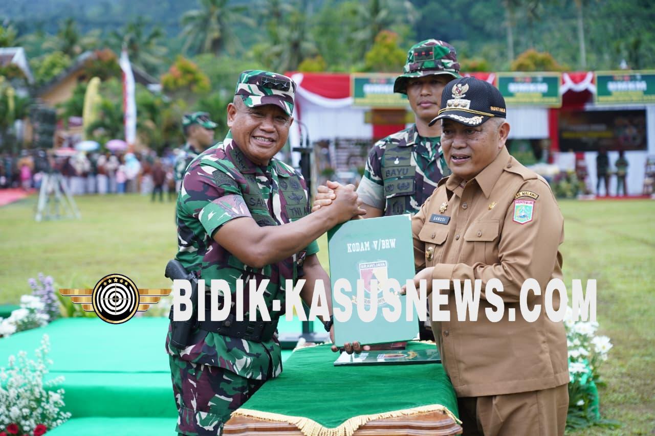 MALANG, BIDIK-KASUSNEWS.COM – Wakil Kepala Staf Angkatan Darat (Wakasad) Letjen TNI Muhammad Saleh Mustafa menegaskan bahwa program TNI Manunggal Membangun Desa (TMMD) merupakan bentuk nyata pengabdian TNI kepada rakyat sekaligus bukti kuatnya kemanunggalan antara TNI dan masyarakat. Pernyataan tersebut disampaikan saat memimpin upacara penutupan TMMD Reguler ke-126 yang digelar di Lapangan Desa Lebakharjo, Kecamatan Ampelgading, Kabupaten Malang, Kamis (6/11/2025). Dalam sambutannya, Wakasad menjelaskan bahwa TMMD tidak semata berfokus pada pembangunan fisik, tetapi juga menjadi sarana untuk membangun karakter, semangat gotong royong, dan kebersamaan di tengah masyarakat desa. Program ini, menurutnya, merupakan wujud kepedulian TNI terhadap kebutuhan masyarakat, terutama di wilayah terpencil dan pedesaan. “Yang kita bangun bukan hanya jalan, tetapi juga semangat gotong royong dan kebersamaan. Inilah bentuk nyata pengabdian TNI bagi rakyat dan kemanunggalan TNI dengan rakyat,” ujar Letjen TNI Muhammad Saleh Mustafa dalam amanatnya. Ia berharap, hasil dari TMMD dapat memberikan manfaat jangka panjang bagi masyarakat serta mendorong warga untuk turut menjaga dan memelihara fasilitas yang telah dibangun bersama TNI. Wakasad juga mengajak seluruh pihak untuk terus melanjutkan semangat kebersamaan yang telah terjalin selama pelaksanaan TMMD. “Mari kita pelihara bersama apa yang sudah kita bangun. Pembangunan ini harus terus dijaga agar memberi manfaat bagi generasi mendatang,” imbuhnya. Upacara penutupan TMMD ke-126 berlangsung khidmat dan diakhiri dengan penyerahan simbolis hasil kegiatan kepada Pemerintah Kabupaten Malang. Seusai upacara, Wakasad meninjau langsung sejumlah sasaran pembangunan serta berdialog dengan warga yang terlibat dalam kegiatan tersebut. Melalui TMMD, TNI Angkatan Darat menegaskan komitmennya untuk terus hadir di tengah masyarakat, memperkuat kemanunggalan TNI–rakyat, serta mendukung percepatan pembangunan di wilayah pedesaan guna meningkatkan kesejahteraan dan kemandirian masyarakat. (Agus)