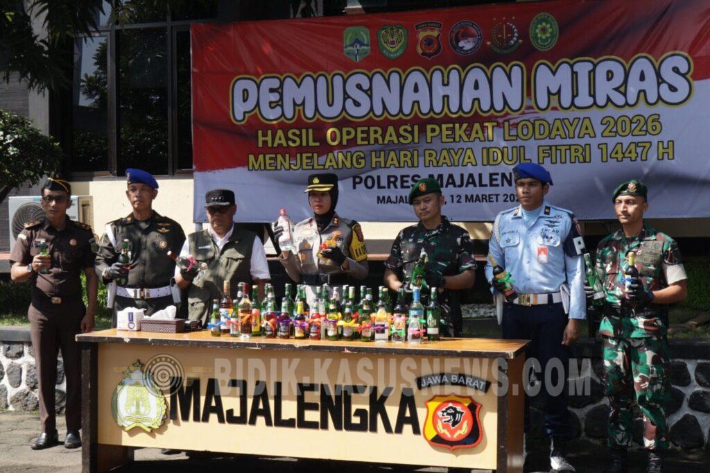 Majalengka,Bidik-kasusnews.com,.Segera setelah pelaksanaan Apel Gelar Pasukan Operasi Ketupat Lodaya 2026, Polres Majalengka melanjutkan agenda penting berupa pemusnahan ribuan botol minuman keras (miras) berbagai merk di halaman Mapolres Majalengka pada Kamis (12/3/2026). Kegiatan ini dipimpin langsung oleh Kapolres Majalengka AKBP Rita Suwadi, S.H., S.I.K., M.M., dengan didampingi oleh Bupati Majalengka Drs. H. Eman Suherman, M.M., Dandim 0617/Majalengka Letkol Inf. Fahmi Guruh Rahayu, S.I.P., M.I.P., serta unsur Forkopimda Kabupaten Majalengka lainnya yang turut hadir dalam rangkaian acara tersebut.