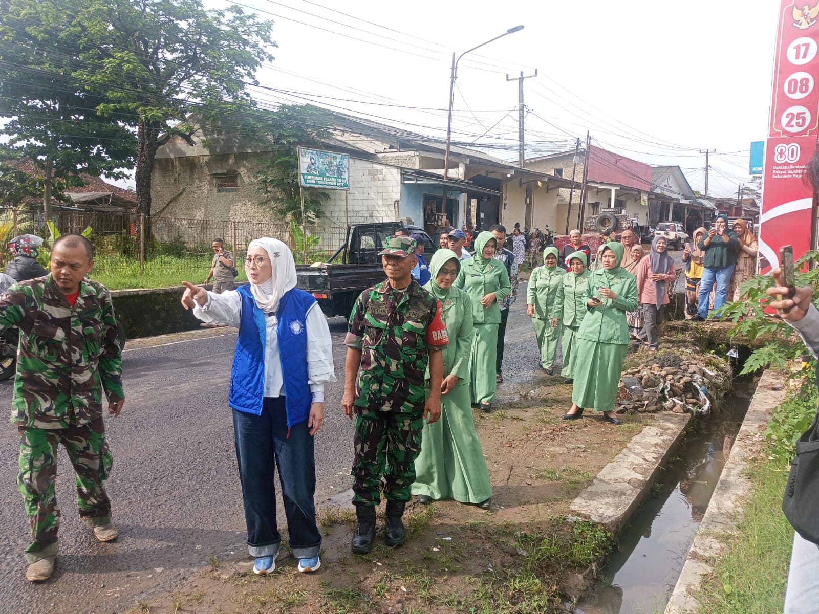 Sebelum memasuki kantor Koramil, Desy Ratnasari juga meninjau area sekitar markas dan menyaksikan langsung aktivitas prajurit yang tengah melaksanakan kerja bakti membersihkan lingkungan serta memperbaiki gorong-gorong di tepi jalan raya.