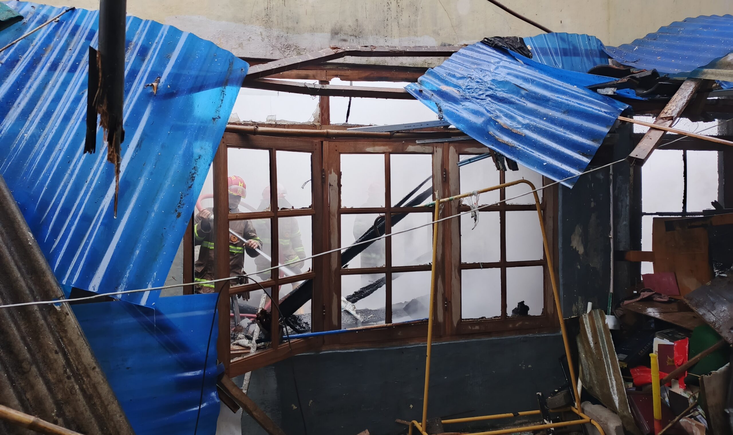 Bangunan dua lantai itu tak mampu diselamatkan dari amukan api. Lantai pertama yang difungsikan sebagai ruang keluarga dan lantai dua atau loteng yang menjadi kamar anaknya hangus terbakar.