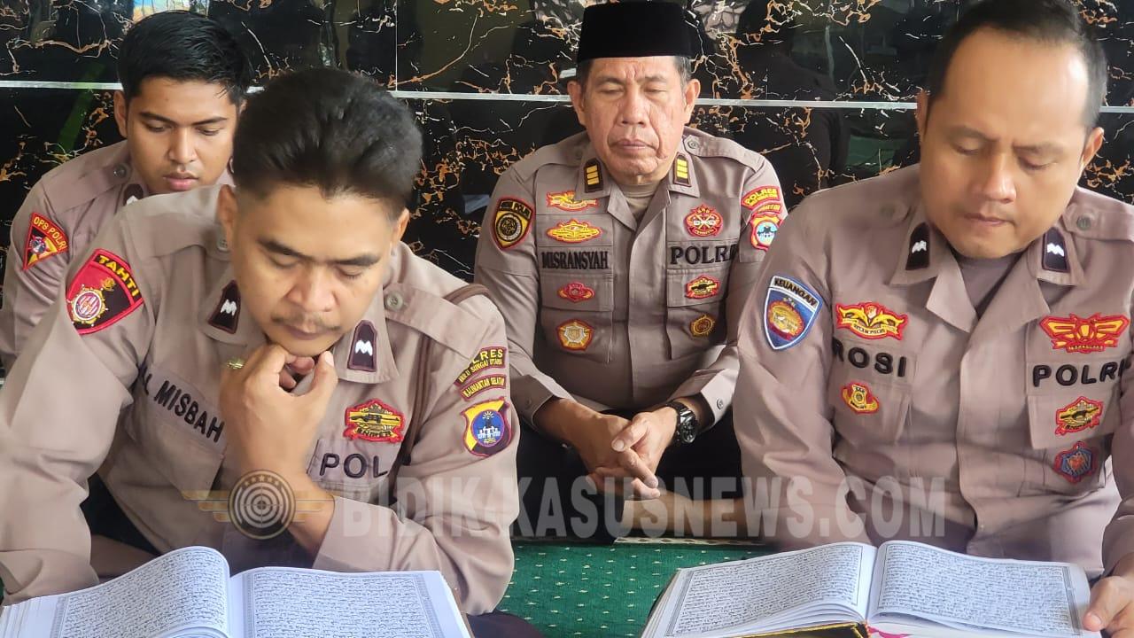 Di Polres Hulu Sungai Utara, kegiatan berlangsung khidmat di masjid lingkungan Mapolres, di mana para personel menyimak dan mengikuti lantunan ayat suci Al-Qur’an secara bersama-sama.