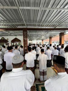 Ibadah dimulai sejak pagi hari dengan pengaturan yang telah dipersiapkan secara matang guna memastikan keamanan dan ketertiban tetap terjaga. Seluruh peserta mengikuti rangkaian sholat berjamaah hingga khutbah dengan tertib dan penuh kekhidmatan.