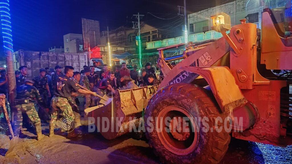 Sejak siang, prajurit TNI menyisir area pasar, badan jalan, gang-gang sempit, hingga saluran drainase yang dipenuhi lumpur dan sampah sisa banjir. Meski kondisi lingkungan masih basah, licin, dan minim penerangan, proses pembersihan tetap dilanjutkan hingga larut demi mempercepat pemulihan aktivitas masyarakat.