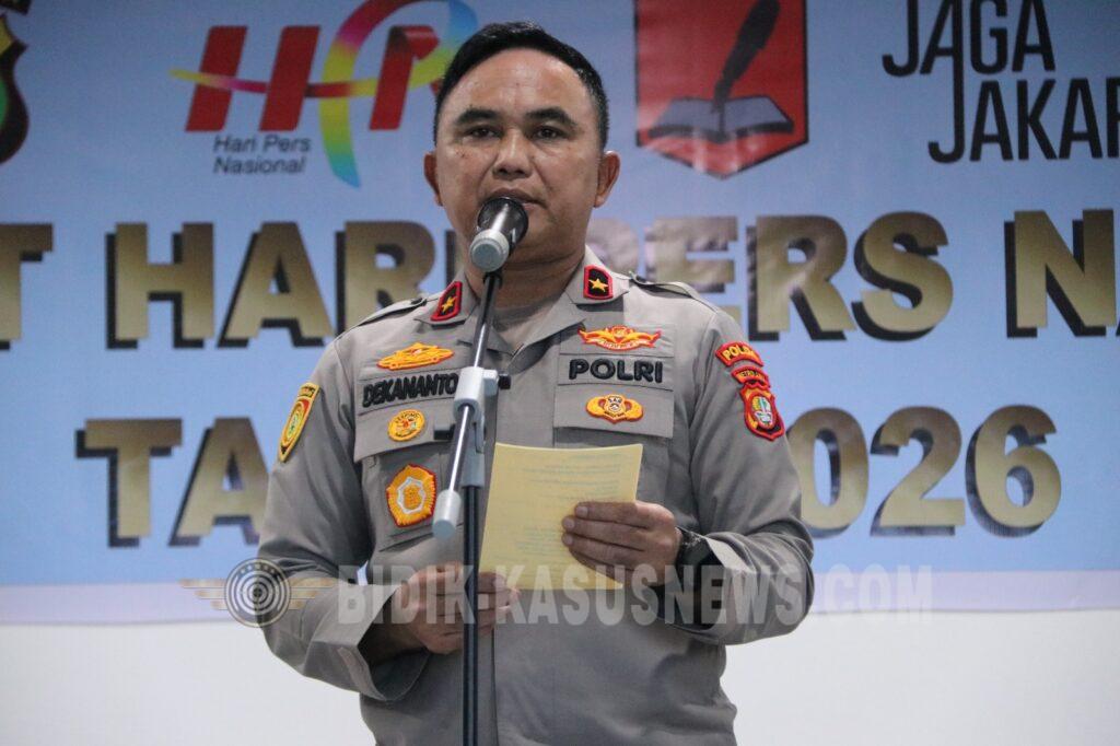 Wakapolda Metro Jaya Brigjen Pol Dekananto Eko Purwono menyampaikan ucapan selamat Hari Pers Nasional 2026 sekaligus apresiasi kepada seluruh insan pers atas peran dan kontribusinya dalam menyampaikan informasi kepada masyarakat. Ia juga menyampaikan salam dan penghargaan dari Kapolda Metro Jaya yang berhalangan hadir karena mengikuti rapat pimpinan TNI–Polri di Istana Negara.