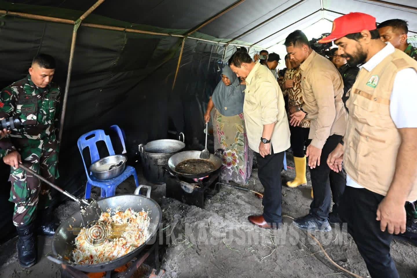 Sesaat setelah tiba, Presiden Prabowo bersama Gubernur Aceh langsung mengecek dapur umum bersama yang dimasak oleh Ibu-Ibu sekitar lokasi pengungsian. Kepala Negara turut mencicipi nasi dan ikan tongkol, menu makan siang yang disiapkan untuk para pengungsi.