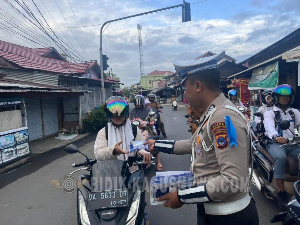 HSU | BIDIK-KASUSNEWS.COM – Dalam rangka meningkatkan kesadaran dan kepatuhan masyarakat terhadap aturan berlalu lintas, Satuan Lalu Lintas (Satlantas) Polres Hulu Sungai Utara (HSU) melaksanakan kegiatan pembagian brosur keselamatan lalu lintas kepada para pengguna jalan dan warga masyarakat, Senin (9/2/2026).