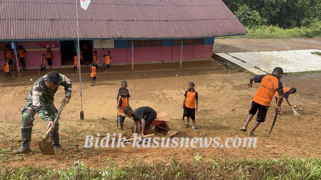 Boven Digoel, Bidik-kasusnews.com – Tentara Nasional Indonesia (TNI) dari Satgas Pamtas RI-PNG Yonif 126/Kalacakti menggelar karya bakti bersama guru dan siswa SD Negeri Persiapan Amupkim di wilayah perbatasan, Jumat (12/9/2025). Kegiatan ini bertujuan menciptakan lingkungan sekolah yang bersih, nyaman, serta mendukung proses belajar-mengajar.