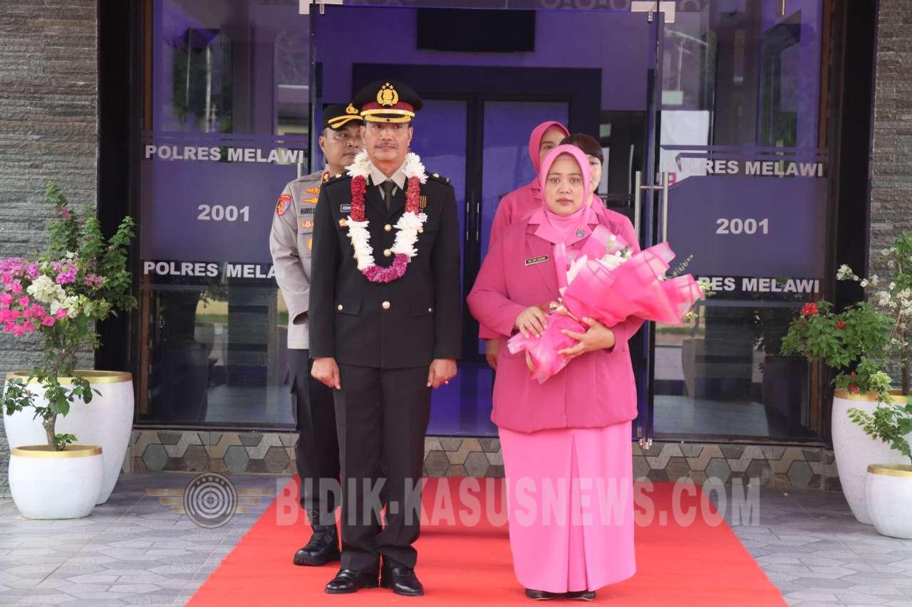 Tampak hadir pula Ketua Bhayangkari Cabang Melawi Ny. Erin Harris Batara bersama jajaran pengurus Bhayangkari Cabang Melawi yang turut memberikan dukungan dan penghormatan dalam momen tersebut.